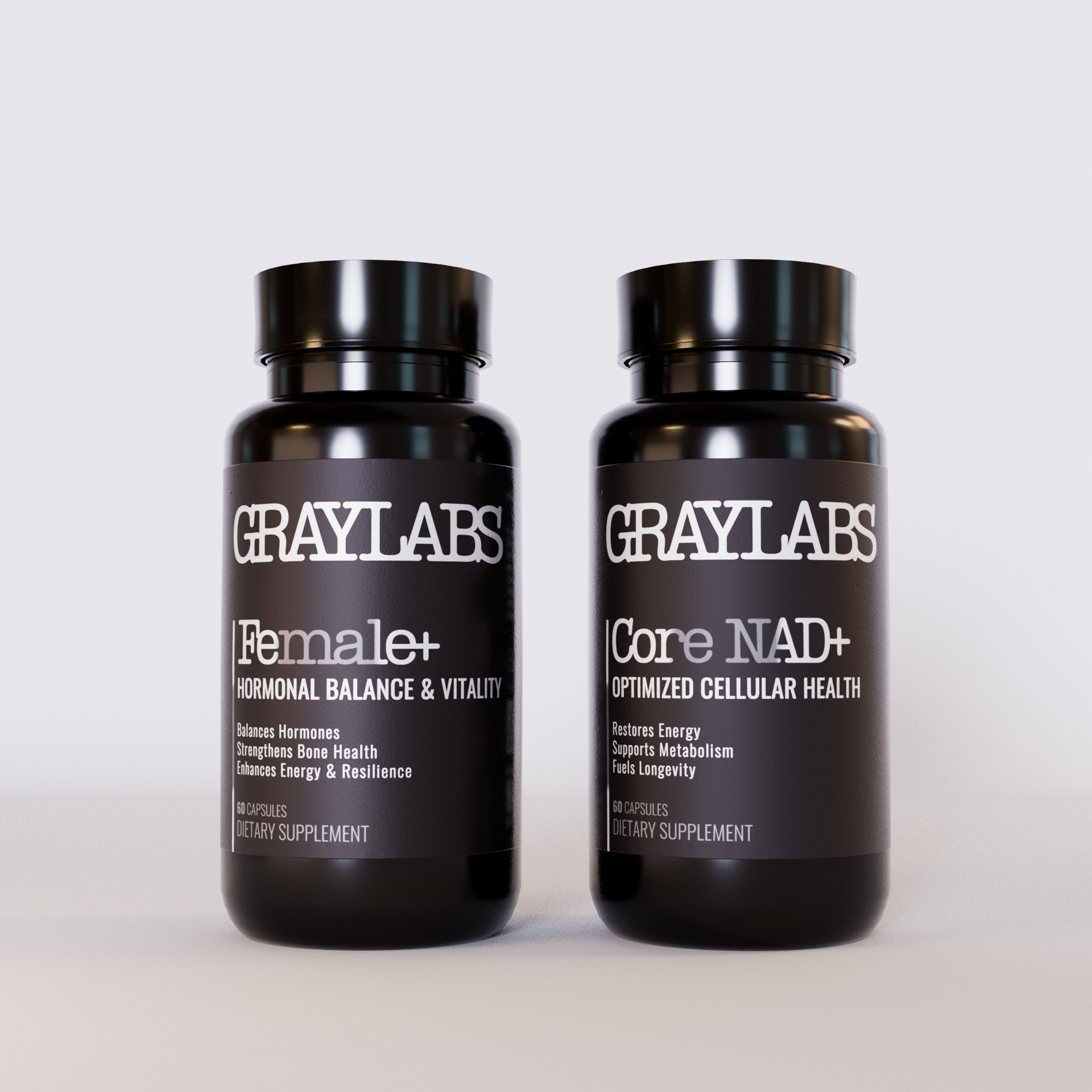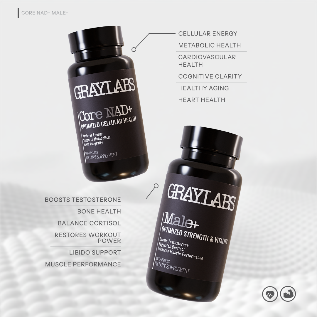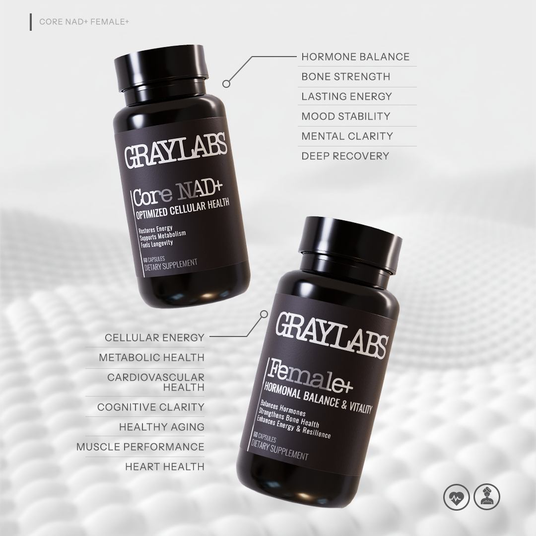 GRAYLABS offers the first modular longevity supplement system, combining Core NAD+ with targeted add-ons; Male+ and Female+ to support energy, metabolism, hormone health, and resilience at the cellular level.