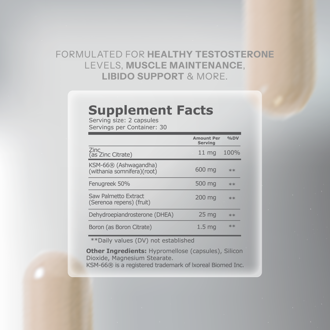 - KSM-66: This clinically studied ashwagandha extract helps maintain healthy testosterone levels by supporting cortisol balance, enhancing strength, and improving stress resilience. Vegan KSM-66 promotes vitality, focus, and stamina—helping you stay driven as hormone levels shift with age.
